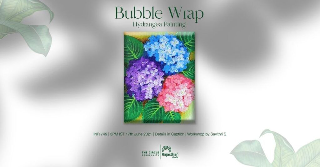 Hydrangeas are basically big balls filled with little flowers. Therefore, the main shape of these flowers is a circle! Then inside of the circle, you paint little 4-5 petal flowers and differ in colours with white. hydrangeas are happy, rich, full of life, a Great kid’s art activity & easy beginner watercolour ideas. The Rooftop Community brings together Bubble Wrap Hydrangea Painting Workshop with Savithri S.