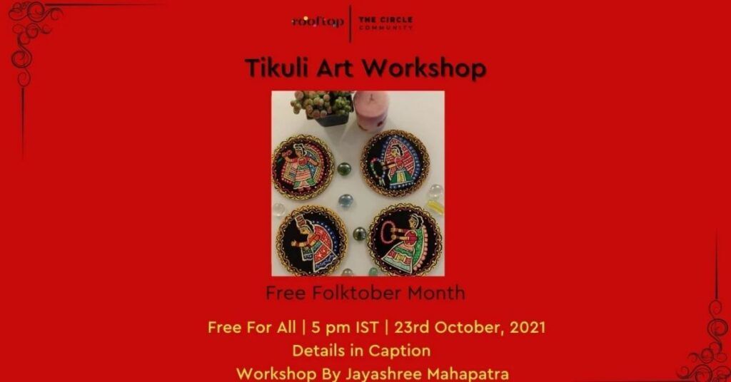 Jayshree greeted all the participants and thanked the host for the lovely introduction. She first started drawing the sketch of the Tikuli art on her canvas. She continued to paint them in shades of yellow, blue, green and red. Mahapatra painted the circle in golden colour painted the background in black colour and outlined the portrait in white colour giving it an artistic touch by making the dots.